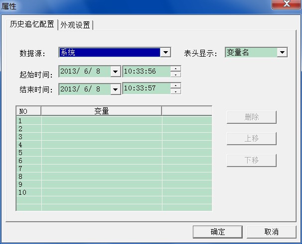 歷史追憶 歷史追憶組件,以表格形式提供指定數據庫點的歷史數據(時間范圍為24小時)?梢越M態(tài)表格顏色及字體大小和字形,數據庫變量,時間范圍。運行時歷史數據按照查詢序號排列,可以配置時間范圍,可以動態(tài)添加需查詢的數據庫點列,把現有列表上的數據庫點替換為新的點名,并有設置表格樣式及列寬、保存和打印功能。