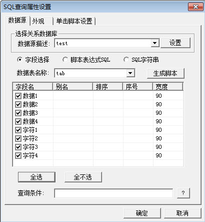 SQL查詢 SQL查詢組件從關系數據庫取得數據以點列表的形式顯示出來。適用于工業(yè)自動化領域,是解決實際開發(fā)過程中報表顯示,輸入,打印輸出等問題的理想解決方案。采用SQL查詢可以極大的減少報表開發(fā)工作量,改善報表的人機界面,提高組態(tài)效率。 可以鏈接的數據庫有ACCESS、SQL Server、Oracle數據庫。通過數據源配置鏈接到相應的數據庫中進行顯示。除了鏈接數據庫的設置和外觀設置,還有單擊腳本設置,其功能主要是用于鼠標點擊指定的單元格觸發(fā)相應的動作。