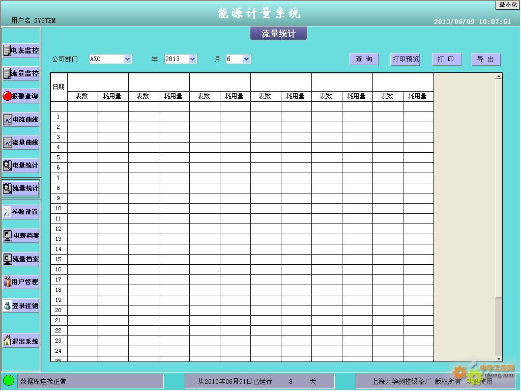 流量統(tǒng)計,可以按部門查詢流量計的累計流量和每天的用消耗量。報表支持打印預(yù)覽、打印、導(dǎo)出等.