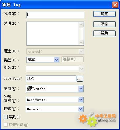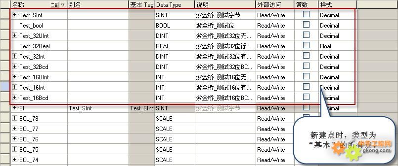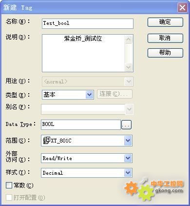輸入點名,在Data Type中選擇相應(yīng)的數(shù)據(jù)類型,確定后該點就建成了。例如:建立一個點名為:Test_bool,類型為:基本,Data Type : BOOL。如下圖所示:
