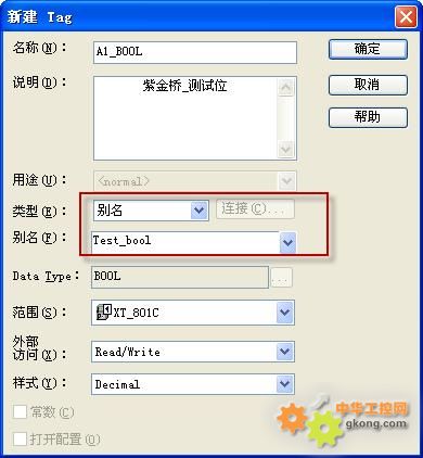 輸入點名,在Data Type中選擇相應(yīng)的數(shù)據(jù)類型,確定后該點就建成了。例如:建立一個點名為:A1_bool,類型為:別名; 在“別名”下拉框內(nèi)選擇點“Test_bool”。 如下圖所示: