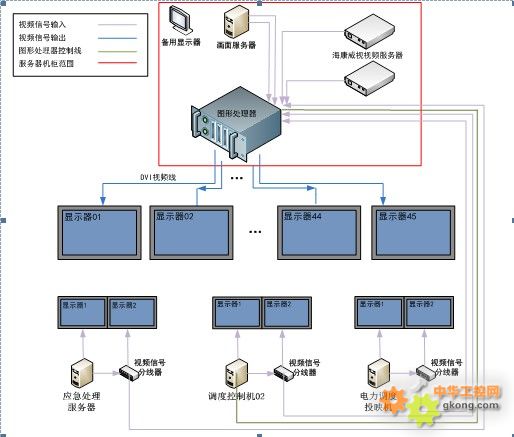 本系統(tǒng)顯示屏幕采用三星提供的拼接屏和圖形處理器,并通過海康威視的視頻服務(wù)器將廠內(nèi)的視頻監(jiān)控信號(hào)進(jìn)行集成。統(tǒng)一在生產(chǎn)指揮調(diào)度中心的大屏幕上進(jìn)行顯示。現(xiàn)場硬件布局如下: