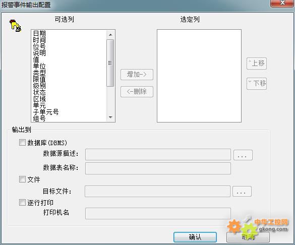 用戶首先需要選擇要輸出哪些項,可以輸出的項很多,包括日期、時間、位號、說明、值等,用戶可以根據(jù)需要將左側(cè)列表框中的項逐一增加到右側(cè)。右側(cè)選定列中為空,則不會輸出任何信息.