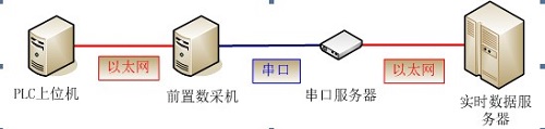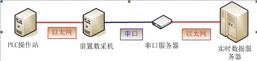 PLC上位機配置ModBus Server,前置數(shù)采機通過以太網(wǎng)ModBus驅(qū)動采集PLC上位機的數(shù)據(jù),前置數(shù)采機和實時數(shù)據(jù)庫服務器之間通過串口通訊,為了延長通訊距離增加串口服務器。