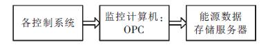 生產(chǎn)車間(熔化車間)是玻璃廠制造、加工及成品的重要單位,其包括窯爐自動化控制系統(tǒng)、退火窯自控系統(tǒng)、電加熱控制系統(tǒng)、成品監(jiān)測及包裝流水線控制系統(tǒng)等;這些系統(tǒng)已具備了相關能耗數(shù)據(jù)的計量采集,通過 OPC技術只需將數(shù)據(jù)轉(zhuǎn)存到本單位能源數(shù)據(jù)存儲服務器上即可。數(shù)據(jù)存儲流程圖如下圖所示: