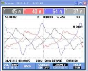 用FLUKE 434對(duì)照明回路進(jìn)行測(cè)量得到電流波形如圖1所示。由圖可知,電流波形與理想的正弦波相去甚遠(yuǎn),畸變較為嚴(yán)重。電流波形的畸變會(huì)導(dǎo)致電壓波形的畸變進(jìn)而影響到其他設(shè)備如計(jì)算機(jī)的正常運(yùn)轉(zhuǎn)。同時(shí)N相電流達(dá)37A,電流不平衡問(wèn)題也比較突出,存在較大的用電隱患。