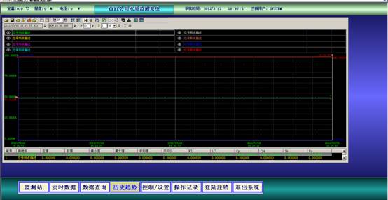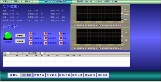 實時數(shù)據(jù)畫面:匯總用戶關(guān)心的所有數(shù)據(jù),重要數(shù)據(jù)以曲線形式實時顯示。在下面的表格中,可以顯示近一段時間內(nèi)的報警。可對當(dāng)前報警進行確認。