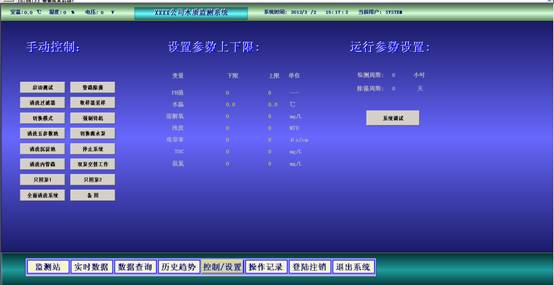 手動控制:在系統(tǒng)完成的一個流程中,內(nèi)部又分為若干的子流程。在間歇時段(非流程運行時段),可以啟動一些獨立的子流程(比如清洗管路,除藻等)。如果系統(tǒng)在運行時發(fā)生緊急情況,可以執(zhí)行強制停機等動作。