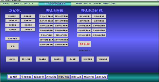 在系統(tǒng)構(gòu)建的前期,設(shè)備還沒有完全裝配結(jié)束時,系統(tǒng)還不能連續(xù)穩(wěn)定的運行。此時經(jīng)常需要對某些設(shè)備進行單獨的調(diào)試起停。在調(diào)試畫面中,可對源水泵,電動閥,電磁閥,各個測量儀器進行完全控制。待各設(shè)備調(diào)試成功后,正式啟動系統(tǒng),周期性運行。