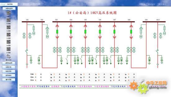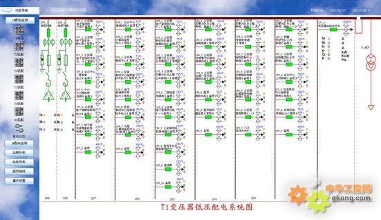 進(jìn)入系統(tǒng)后通過遙測我們可以查看各回路的三相線電壓、電流、功率、電能等電參量。遙信功能則實(shí)現(xiàn)了顯示現(xiàn)場設(shè)備的運(yùn)行狀態(tài),主要包括:開關(guān)的分、合閘運(yùn)行狀態(tài)和通訊故障報(bào)警,斷路器變位時(shí)會(huì)發(fā)出報(bào)警信號(hào)。如下圖2,高壓配電系統(tǒng)主要監(jiān)測了高壓回路的運(yùn)行狀態(tài),紅色代表合閘,綠色代表分閘;并在畫面上動(dòng)態(tài)顯示三相電流、線電壓。