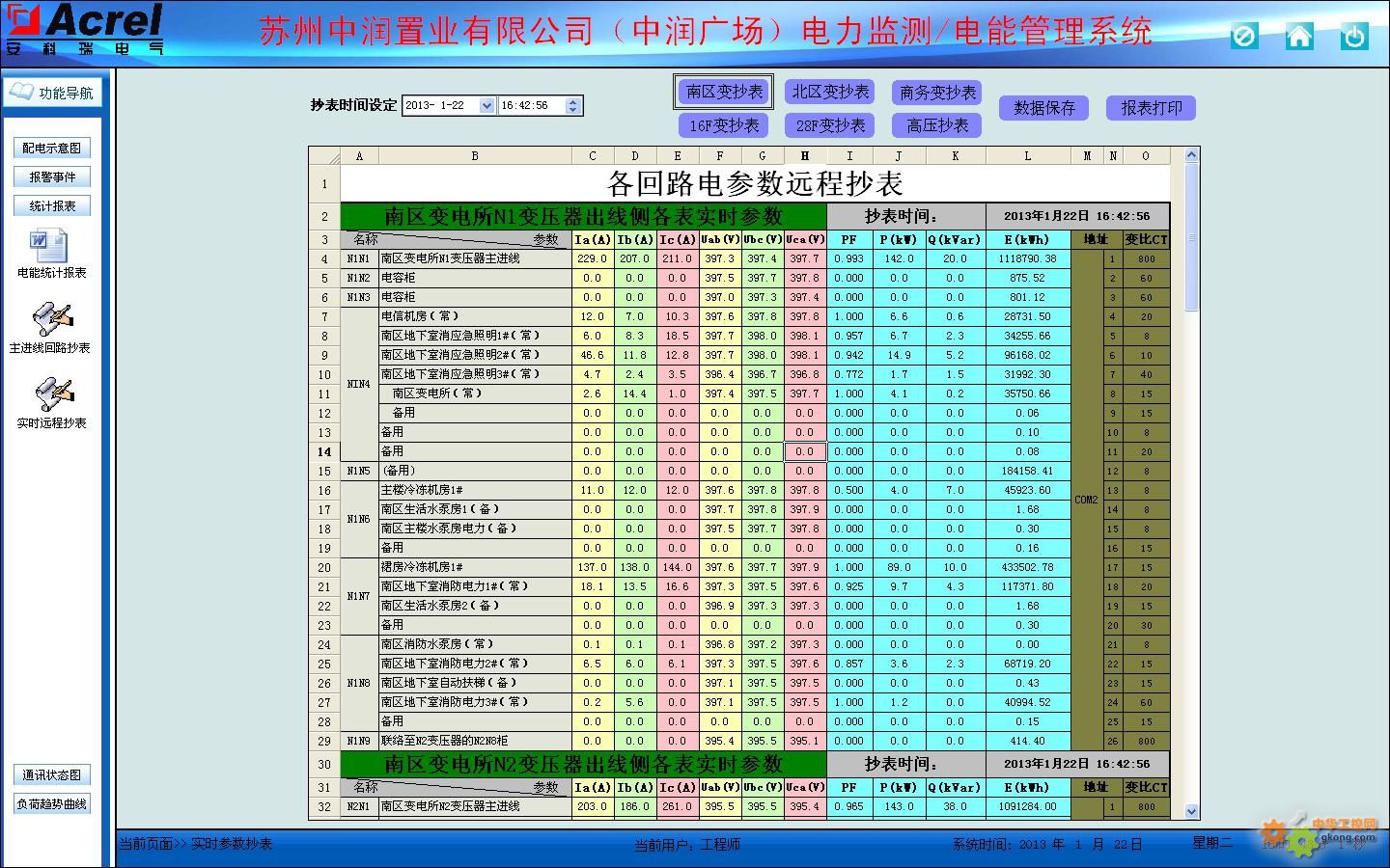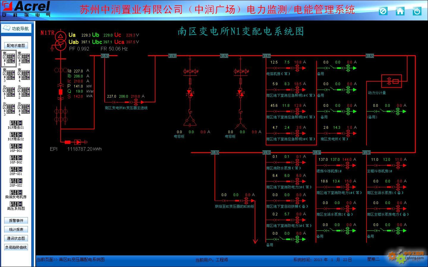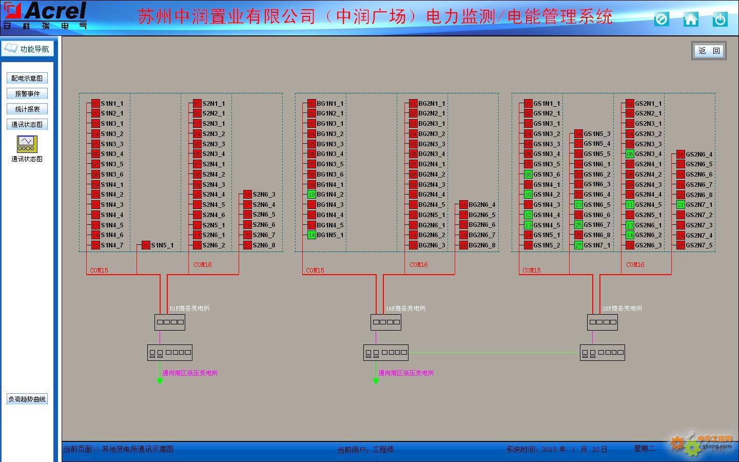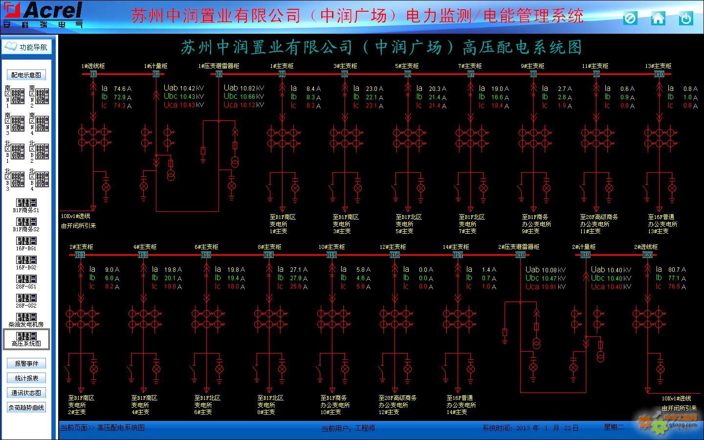 蘇州中潤廣場電力監(jiān)控與電能管理系統(tǒng)分一個高壓室、一個發(fā)電機房和五個低壓變電所(南區(qū)變電所、北區(qū)變電所、地下一層商務(wù)變電所、16層變電所和28層變電所),本項目針對這一個高壓室、一個發(fā)電機房和五個低壓變電所的10/0.4kV配電系統(tǒng)進行用電監(jiān)控與電能管理;監(jiān)控范圍為地下一層高壓室的高壓柜,柴油發(fā)電機房配電屏,南區(qū)變電所的N1、N2、N3、N4變壓器的低壓進線柜、聯(lián)絡(luò)柜、饋線柜,北區(qū)變電所的B1、B2、B3、B4變壓器的低壓進線柜、聯(lián)絡(luò)柜、饋線柜,地下一層商務(wù)變電所的S1、S2變壓器的低壓進線柜、聯(lián)絡(luò)柜、饋線柜,16層變電所的BG1、BG2變壓器的低壓進線柜、聯(lián)絡(luò)柜、饋線柜,28層變電所的GS1、GS2變壓器的低壓進線柜、聯(lián)絡(luò)柜、饋線柜進行遠程實時監(jiān)控和電能管理。