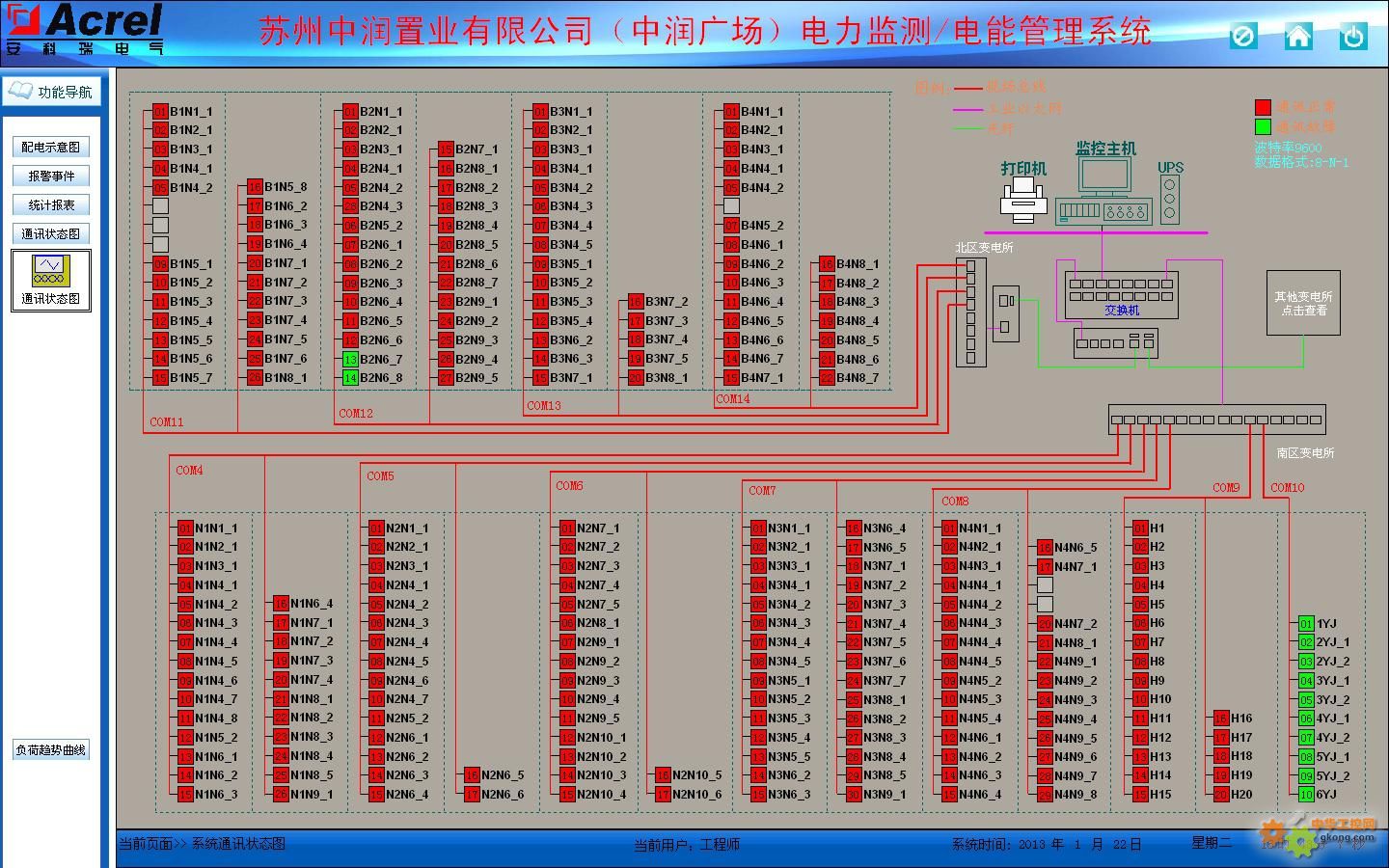 本監(jiān)控系統(tǒng)主要實現(xiàn)蘇州中潤廣場的一個高壓室、一個發(fā)電機房和五個低壓變電所(南區(qū)變電所、北區(qū)變電所、地下一層商務(wù)變電所、16層變電所和28層變電所)的10/0.4kV配電系統(tǒng)進行用電監(jiān)控與電能管理;監(jiān)控范圍為地下一層高壓室的高壓柜,柴油發(fā)電機房配電屏,南區(qū)變電所的N1、N2、N3、N4變壓器的低壓進線柜、聯(lián)絡(luò)柜、饋線柜,北區(qū)變電所的B1、B2、B3、B4變壓器的低壓進線柜、聯(lián)絡(luò)柜、饋線柜,地下一層商務(wù)變電所的S1、S2變壓器的低壓進線柜、聯(lián)絡(luò)柜、饋線柜,16層變電所的BG1、BG2變壓器的低壓進線柜、聯(lián)絡(luò)柜、饋線柜,28層變電所的GS1、GS2變壓器的低壓進線柜、聯(lián)絡(luò)柜、饋線柜進行遠程實時監(jiān)控和電能管理。該系統(tǒng)總計有393只儀表(其中包括21只ACR230ELH、356只ACR220EL和16只ABB綜保),分18條總線,其中高壓室2條總線、發(fā)電機房1條總線、南區(qū)變電所4條總線、北區(qū)變電所4條總線、地下一層商務(wù)變電所2條總線、16層變電所2條總線、28層變電所2條總線,5個低壓變電所之間距離較遠,采用光纖組網(wǎng)連接,最后通過網(wǎng)線拉至值班室連接到監(jiān)控主機實現(xiàn)總線上儀表與監(jiān)控主機的數(shù)據(jù)連通。
