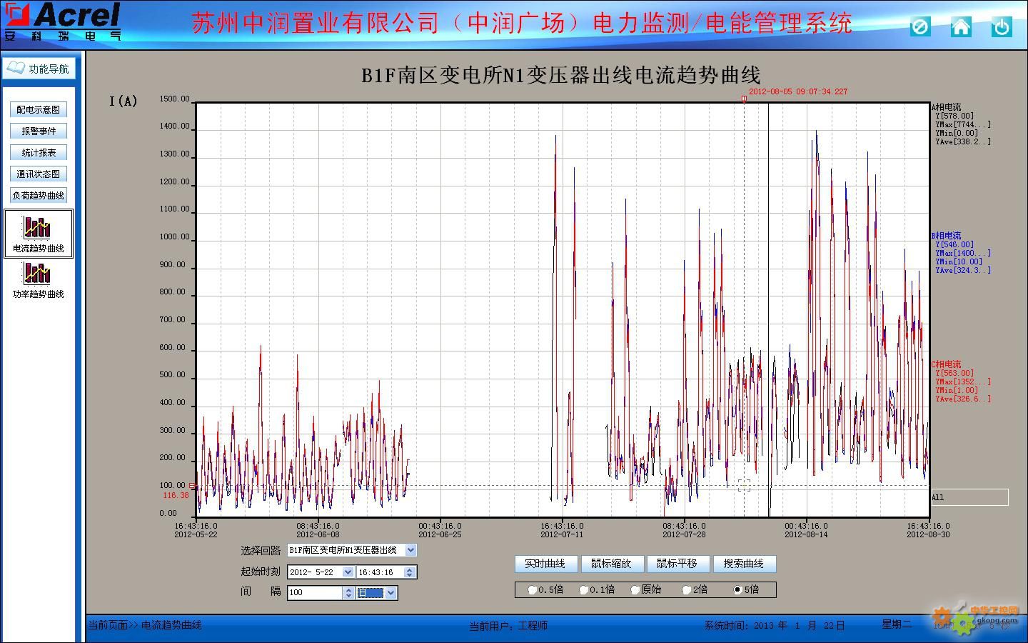 負荷趨勢曲線功能主要負責定時采集進線及重要回路電流和功率負荷參量,自動生成運行負荷趨勢曲線的,方便用戶及時了解設(shè)備的運行負荷狀況。點擊畫面相應(yīng)按鈕或菜單項可以完成相應(yīng)功能的切換;可以查看實時趨勢曲線或歷史趨勢線;對所選曲線可以進行平移、縮放、量程變換等操作,幫助用戶進線趨