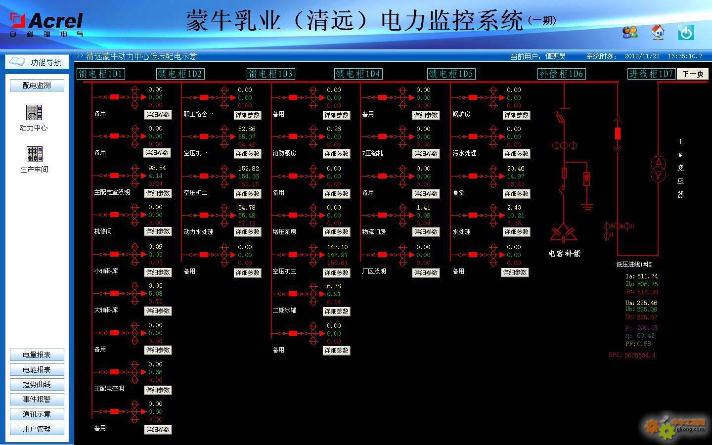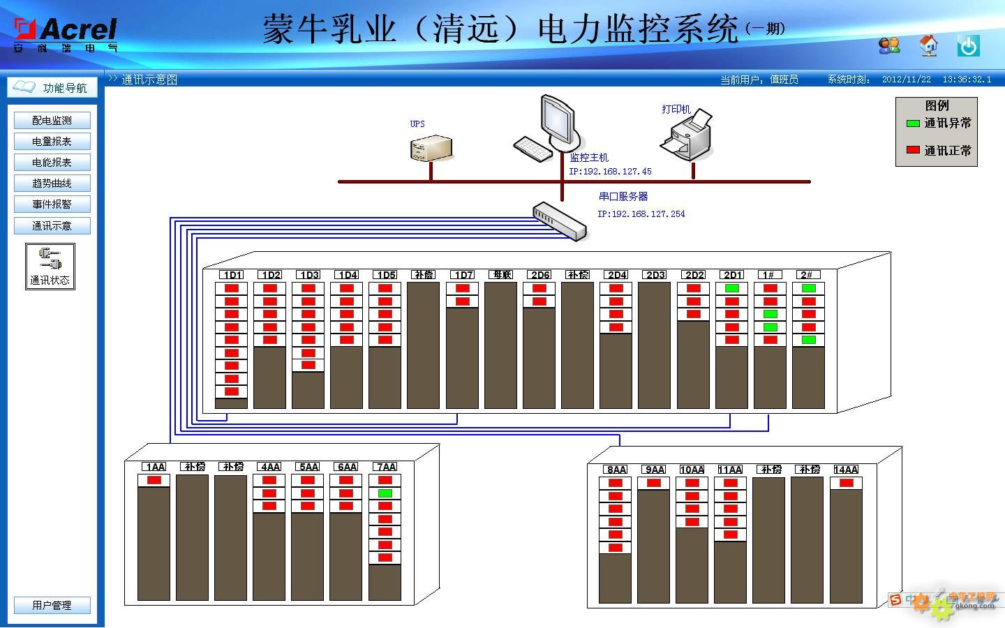 根據(jù)配電系統(tǒng)管理的要求,需要對清遠(yuǎn)蒙牛事業(yè)部一期和二期所有低壓配出線進(jìn)行電力監(jiān)控,且在一期與二期值班室內(nèi)需設(shè)有獨立的監(jiān)控系統(tǒng)平臺,同時該監(jiān)控平臺也可查看另一平臺的實時數(shù)據(jù),以保證用電的安全、可靠和高效。