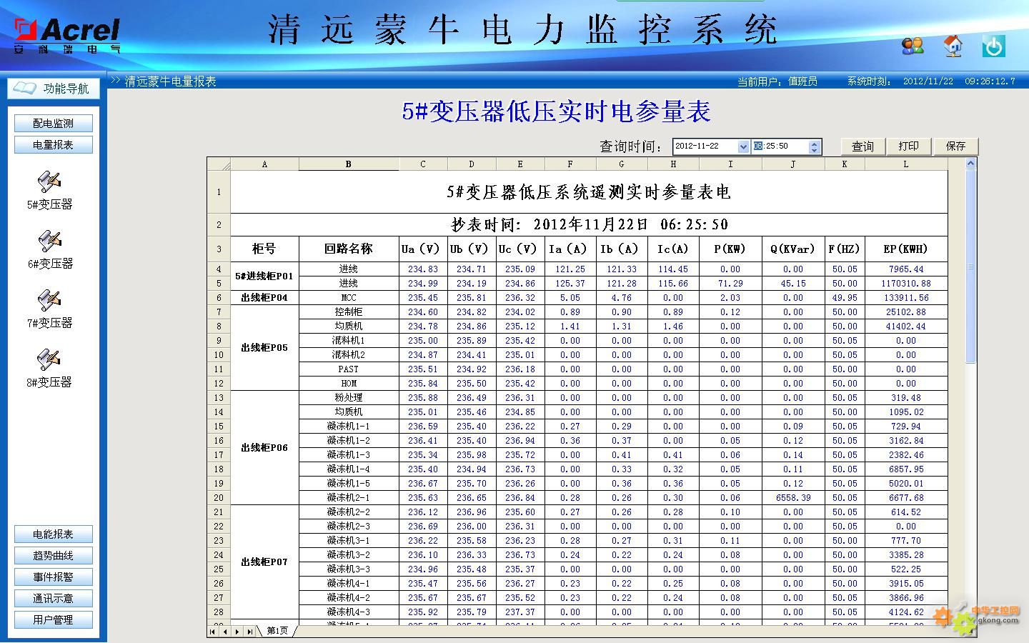 參數(shù)抄表功能,主要對低壓各出線回路的電參數(shù)進(jìn)線查詢。支持任意時刻電參數(shù)查詢,具備數(shù)據(jù)導(dǎo)出和報表打印等功能。該報表查詢供兩個變電所8臺變壓器出線各低壓回路的電參數(shù),主要包括:三相電壓、三相電流、有功功率、無功功率、頻率和有功電度。該報表各回路名稱和數(shù)據(jù)庫關(guān)聯(lián),方便用戶修改回路名稱,如圖(6)為5#變壓器回路實時數(shù)據(jù)顯示。