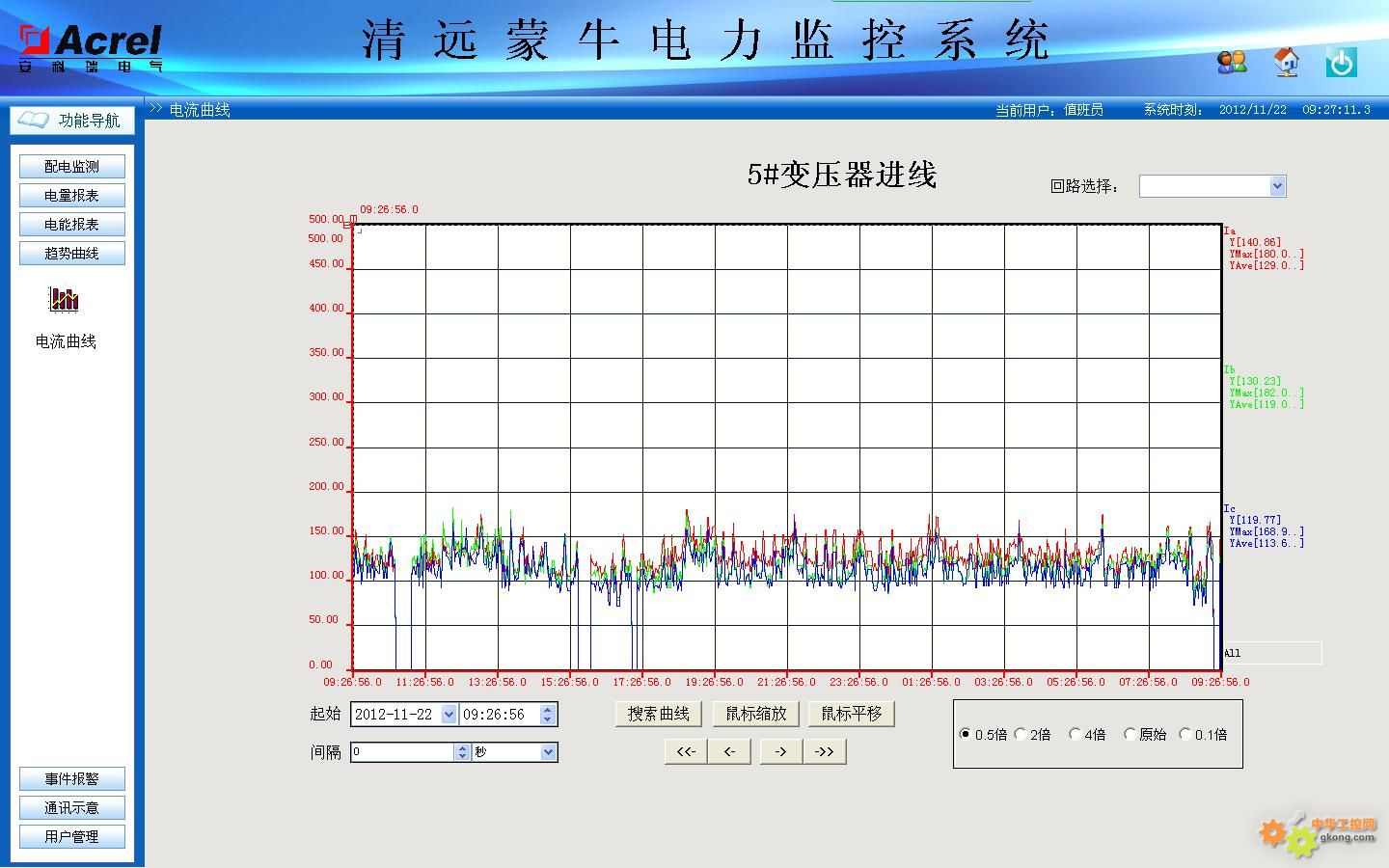 負(fù)荷趨勢曲線功能主要負(fù)責(zé)定時采集進(jìn)線及重要回路電流和功率負(fù)荷參量,自動生成運行負(fù)荷趨勢曲線的,方便用戶及時了解設(shè)備的運行負(fù)荷狀況。點擊畫面相應(yīng)按鈕或菜單項可以完成相應(yīng)功能的切換;可以查看實時趨勢曲線或歷史趨勢線;對所選曲線可以進(jìn)行平移、縮放、量程變換等操作,幫助用戶進(jìn)線趨
