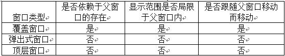 窗口按類型可分為:覆蓋窗口、彈出式窗口和頂層窗口。