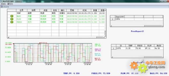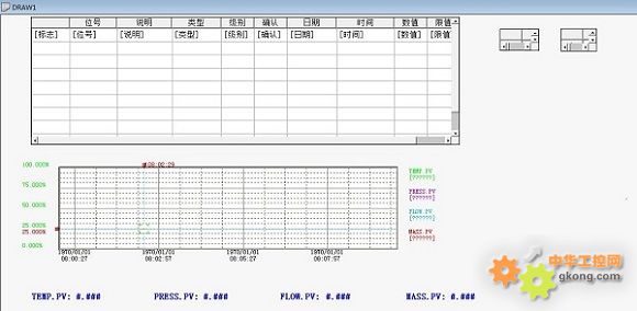 4.在畫面上組態(tài)了點FLOW,TEMP,MASS,PRESS的PV參數值的模擬輸出,通過PV參數值的動態(tài)變化,證明了從關系庫到紫金橋歷史庫數據插入的成功。