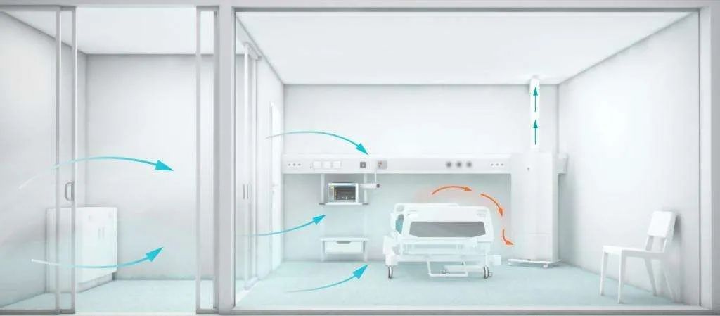 負(fù)壓隔離室采用先進(jìn)的通風(fēng)系統(tǒng),形成隔離區(qū)域不同位置的氣壓梯度,確保隔離區(qū)域的氣壓低于自然界氣壓,讓自然界空氣可以流入到隔離區(qū)域。通過負(fù)壓隔離可以對傳染性疾病起到污染隔絕的作用,防止受到疾病污染的空氣對病房以外的環(huán)境和患者以外的人的感染。