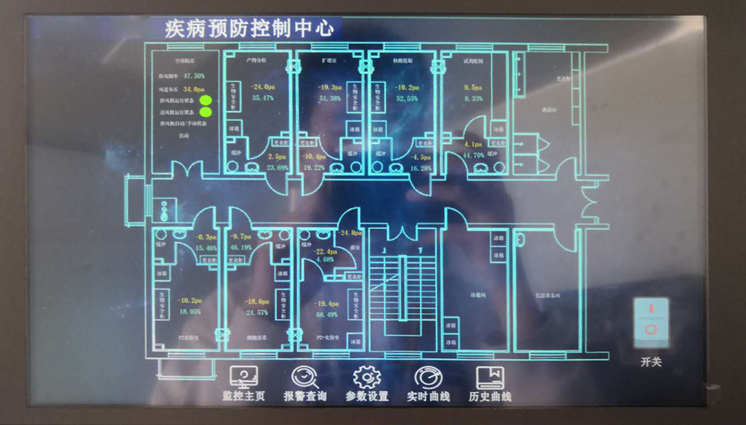 根據(jù)負(fù)壓值控制外界新鮮空氣的流入,負(fù)壓梯度保證空氣從低污染區(qū)向高污染區(qū)流動。7個不同類型的實(shí)驗(yàn)室,受污染的程度不同,負(fù)壓依次設(shè)定為:-30Pa(產(chǎn)物分析)、-20Pa(擴(kuò)增室)、-20Pa(細(xì)胞培養(yǎng))、-20Pa(P2+實(shí)驗(yàn)室)、-10Pa(P2實(shí)驗(yàn)室)、-10Pa(試劑配制)、-10Pa(核酸提取)。負(fù)壓梯度的建立,可以降低空氣污染程度,抑制病毒的傳播,實(shí)現(xiàn)環(huán)境安全。