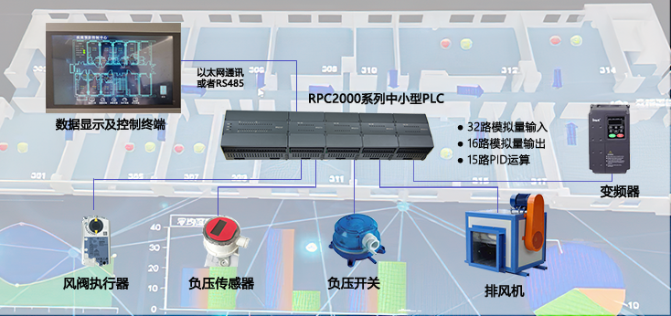 值得稱道的是,該方案僅用一套RPC2000系列PLC就可實(shí)現(xiàn)全部功能。CPU模塊自帶開關(guān)量輸入和輸出,通過擴(kuò)展模塊實(shí)現(xiàn)32路模擬量輸入和16路模擬量輸出,同時控制15間負(fù)壓隔離實(shí)驗(yàn)室。憑借強(qiáng)大的運(yùn)算和控制能力,RPC2000高效、精準(zhǔn)地實(shí)現(xiàn)了以往2至3套小型PLC才能實(shí)現(xiàn)的各項(xiàng)功能。