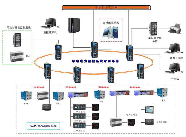 一、 項(xiàng)目概述 地鐵作為城市建設(shè)的大型基礎(chǔ)設(shè)施,不僅是城市公交客運(yùn)的骨干系統(tǒng),而且是作為城市建設(shè)和土地開發(fā)的支持系統(tǒng).地鐵現(xiàn)代化的發(fā)展,已成為城市交通現(xiàn)代化的重要標(biāo)志之一. 地鐵車站電力備監(jiān)控系統(tǒng)分為中央級(jí)、車站級(jí)和就地級(jí)三級(jí)對(duì)車站電力進(jìn)行監(jiān)控,在中央級(jí)和車站級(jí)進(jìn)行系統(tǒng)管理.車站電力監(jiān)控系統(tǒng)對(duì)全線各個(gè)車站的電力設(shè)備進(jìn)行全面、有效的自動(dòng)化監(jiān)控及管理,確保設(shè)備處于高效、節(jié)能、可靠的最佳運(yùn)行狀態(tài),創(chuàng)造一個(gè)舒適的地下環(huán)境;并能在緊急事故狀態(tài)下,更好地協(xié)調(diào)車站設(shè)備的運(yùn)行,充分發(fā)揮各種電力設(shè)備應(yīng)有的作用,保證全線安全正常運(yùn)行. 中央級(jí)電力監(jiān)控系統(tǒng)由中央級(jí)環(huán)型局域網(wǎng)絡(luò)構(gòu)成,網(wǎng)絡(luò)內(nèi)包括主備監(jiān)控主機(jī),主備服務(wù)器,檔案管理計(jì)算機(jī),網(wǎng)絡(luò)交換機(jī)(通信轉(zhuǎn)換接口),打印機(jī),打印機(jī)服務(wù)器,大屏幕顯示系統(tǒng)和UPS等設(shè)備. 車站級(jí)監(jiān)控系統(tǒng)組成由設(shè)置于車站環(huán)控、電控室和車站控制室(SCR)的可編程序控制器(PLC)采集現(xiàn)場設(shè)備的狀態(tài)信號(hào),通過網(wǎng)絡(luò)通訊線傳遞到車站級(jí)服務(wù)器及監(jiān)控工作站,車站監(jiān)控人員再通過工作站下達(dá)控制指令,由PLC傳遞到現(xiàn)場設(shè)備完成. 二、系統(tǒng)需求: 工作環(huán)境相對(duì)比較惡劣,可靠性要求高,高電磁干擾環(huán)境; 網(wǎng)絡(luò)要求具有冗余功能,高可用性; 要求網(wǎng)絡(luò)有擴(kuò)展性; 要求產(chǎn)品應(yīng)用廣泛,在地鐵行業(yè)有豐富的經(jīng)驗(yàn),具有極佳的知名度; 統(tǒng)一的網(wǎng)絡(luò)管理功能; 要求高帶寬,大容量數(shù)據(jù)傳輸能力; 地鐵節(jié)點(diǎn)按長距離考慮; 能為今后運(yùn)行的網(wǎng)絡(luò)進(jìn)行擴(kuò)展而不使其受到影響; 三、網(wǎng)絡(luò)拓?fù)洌?/SPAN>