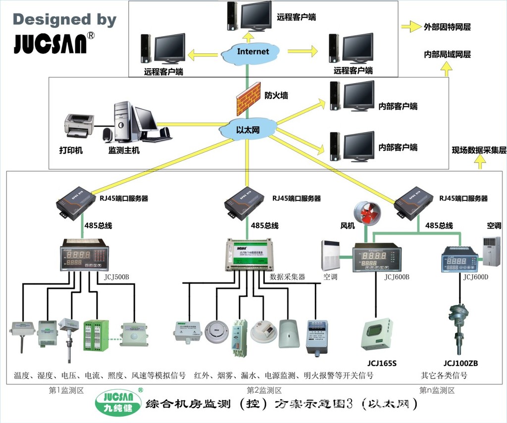 3、通過JCJ708/716DO智能控制器實現(xiàn)現(xiàn)場聲光報警、對空調(diào)等設(shè)備實現(xiàn)自動控制。