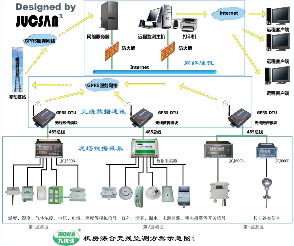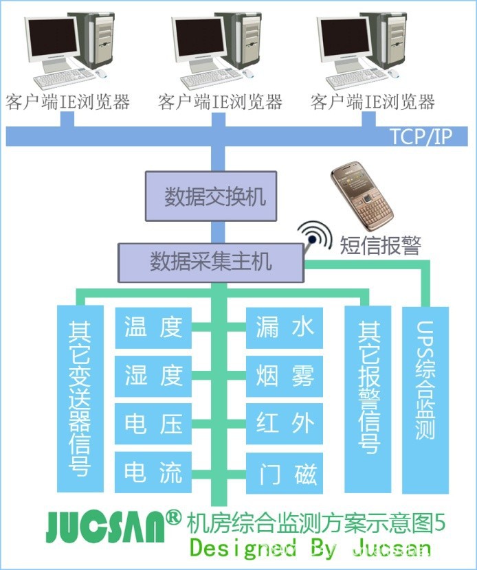 功能簡介:實現(xiàn)對機(jī)房內(nèi)溫濕度、電流、電壓、漏水、煙感、紅外、電源工作狀態(tài)等信號進(jìn)行采集,并將這些信號連接到數(shù)據(jù)采集器、智能測控儀等設(shè)備上,并通過無線數(shù)傳設(shè)備將信號無線傳輸?shù)焦芾碇行牡挠嬎銠C(jī)上,通過機(jī)房監(jiān)測軟件對各組數(shù)據(jù)進(jìn)行分析、處理,通過網(wǎng)絡(luò)實現(xiàn)遠(yuǎn)程IE瀏覽,同時在監(jiān)測現(xiàn)場通過各類控制器對現(xiàn)場設(shè)備進(jìn)行自動化控制。