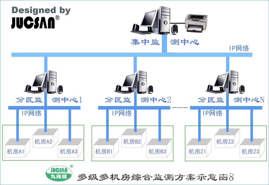 適用于對多個區(qū)域的多個機(jī)房綜合監(jiān)測。將服務(wù)器安裝于中心機(jī)房,各區(qū)域的機(jī)房通過網(wǎng)絡(luò)與中心機(jī)房服務(wù)器相連接。機(jī)房管理人員在網(wǎng)內(nèi)任何一臺電腦都可以查看任意機(jī)房的監(jiān)測信息。