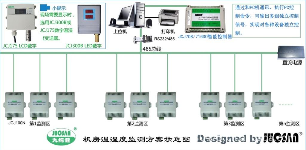 1、通過JCJ100N數(shù)字溫濕度變送器實現(xiàn)對機(jī)房多點溫濕度監(jiān)測。
