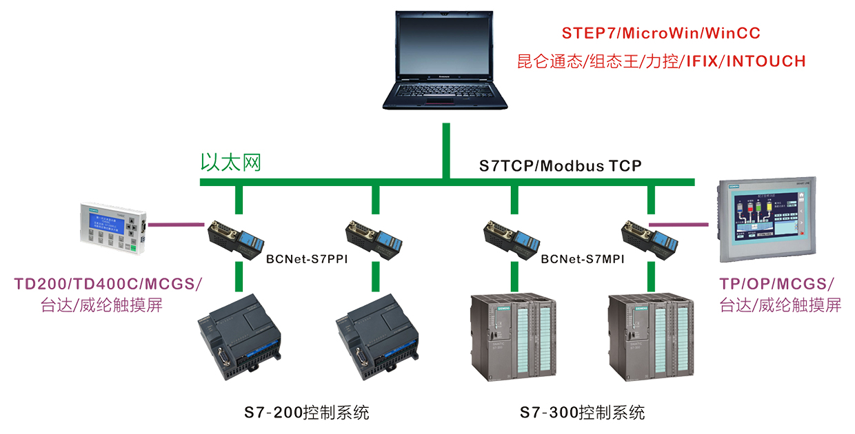 BCNet-S7PPI橋接型:可以連非西門子觸摸屏,如昆侖通態(tài)、威綸、臺達(dá)、步科、海泰克、施耐德等。