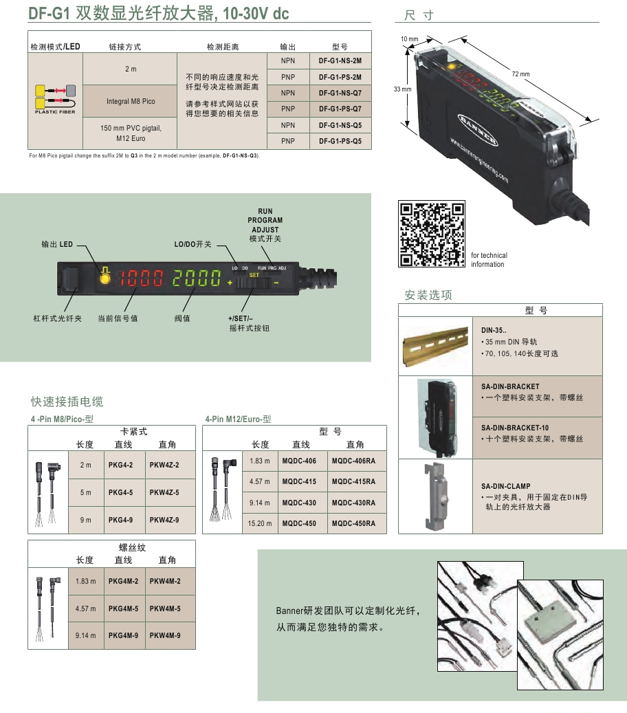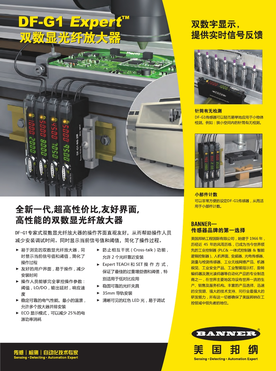 DF-G1專家式雙數(shù)顯光纖放大器的操作界面直觀友好,從而幫助操作人員減少安裝調(diào)試時間。同時顯示當(dāng)前信號值和閾值,簡化了操作過程。DF-G1傳感器可以輕而易舉地應(yīng)用于小物體 檢測。例如:狹小空間內(nèi)的針筒有無檢測??梢苑浅7奖愕脑O(shè)定DF-G1傳感器,從而適用于小部件計數(shù)。