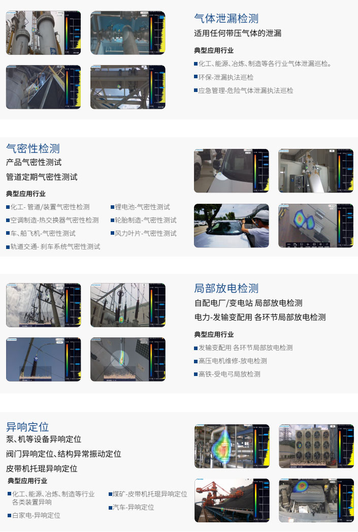 產(chǎn)品可應(yīng)用于帶壓氣體泄漏、真空泄漏、異響定位、氣密性測(cè)試、局部放電檢測(cè)等方向。