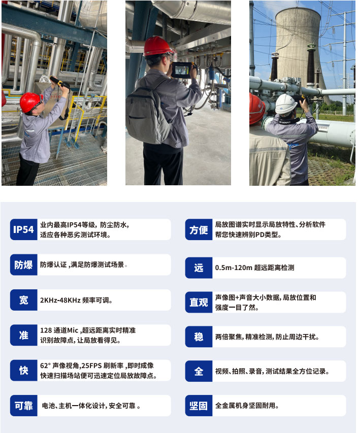 手持式聲學(xué)成像儀集成采集、處理、顯示,記錄功能于一身,內(nèi)部配大容量鋰電池實(shí)現(xiàn)超長(zhǎng)續(xù)航, 7 寸顯屏幕清晰查看故障,拍照、錄像多種方式記錄故障點(diǎn)信息。配套PC工具一鍵生成報(bào)告。讓巡檢 人員及質(zhì)檢人員高效、精準(zhǔn)定位故障。該產(chǎn)品可應(yīng)用于帶壓氣體泄漏、真空泄漏、異響定位、氣密性 測(cè)試、局部放電檢測(cè)等方向,真正意義上的多功能故障檢測(cè)儀。