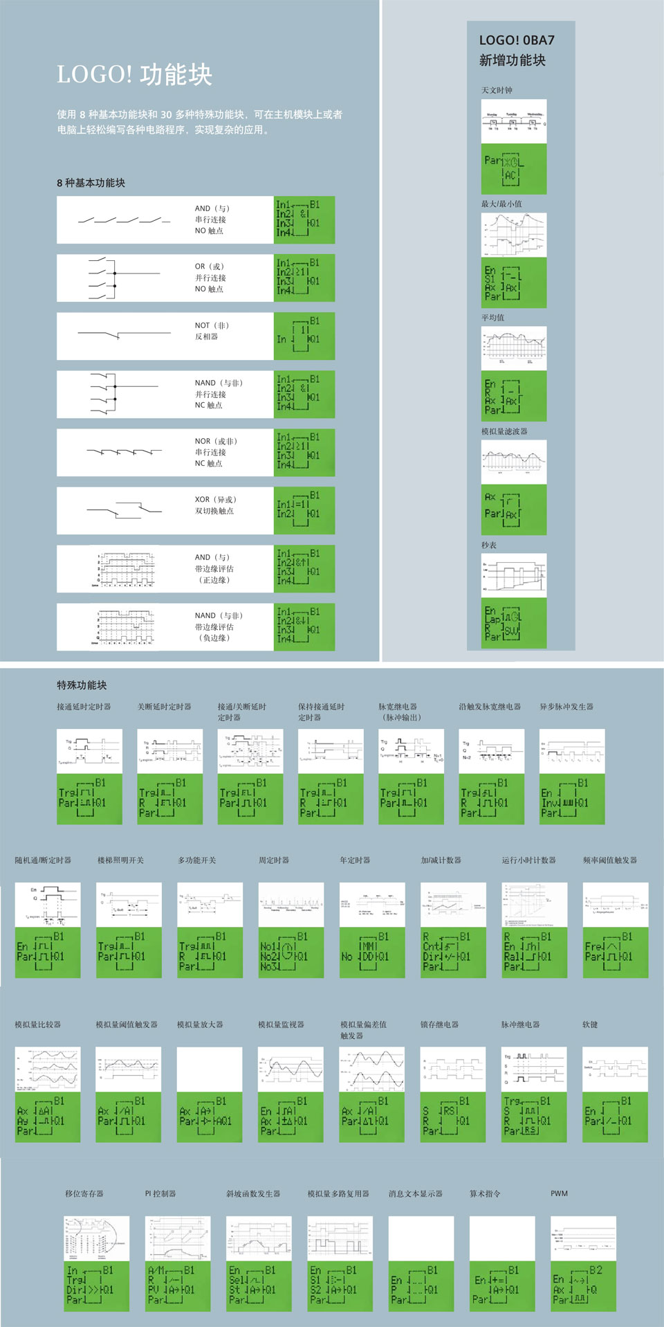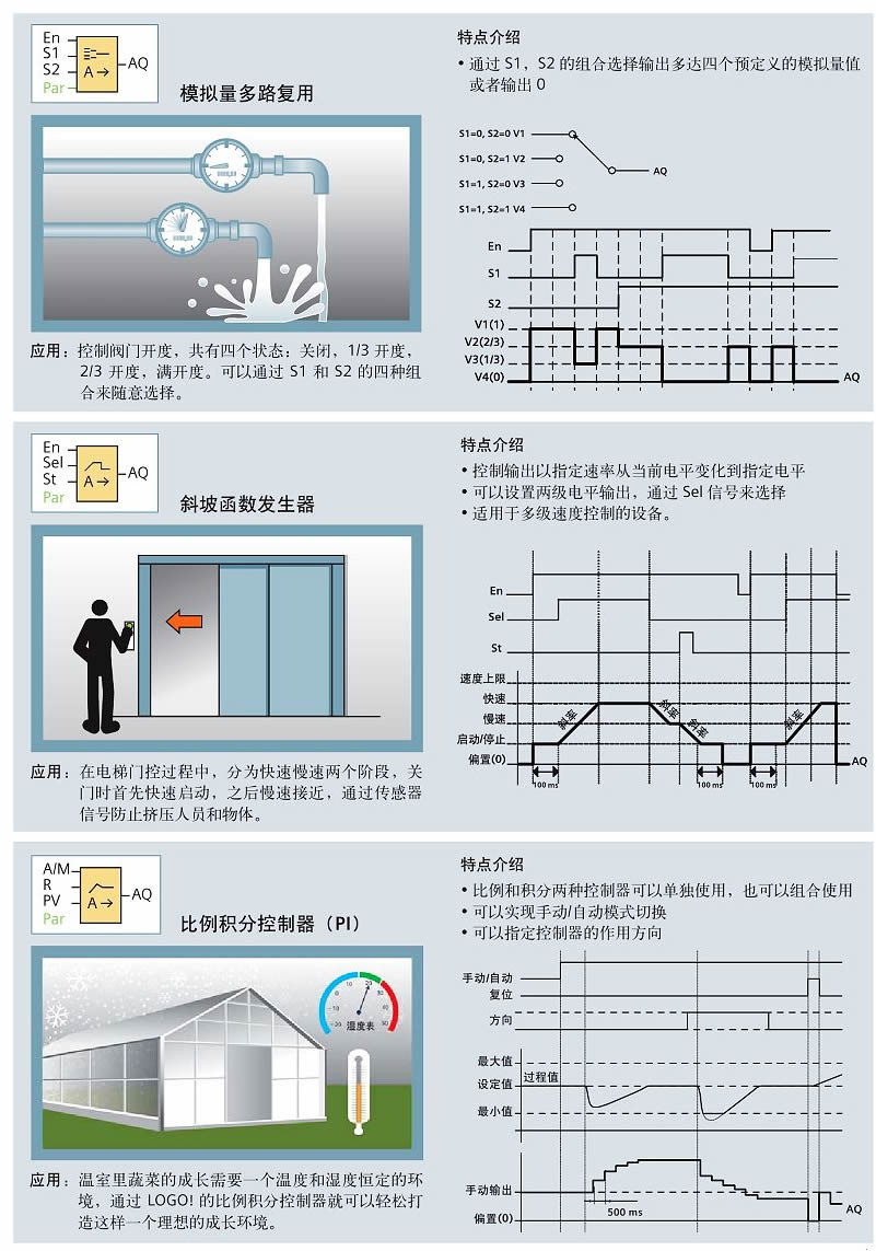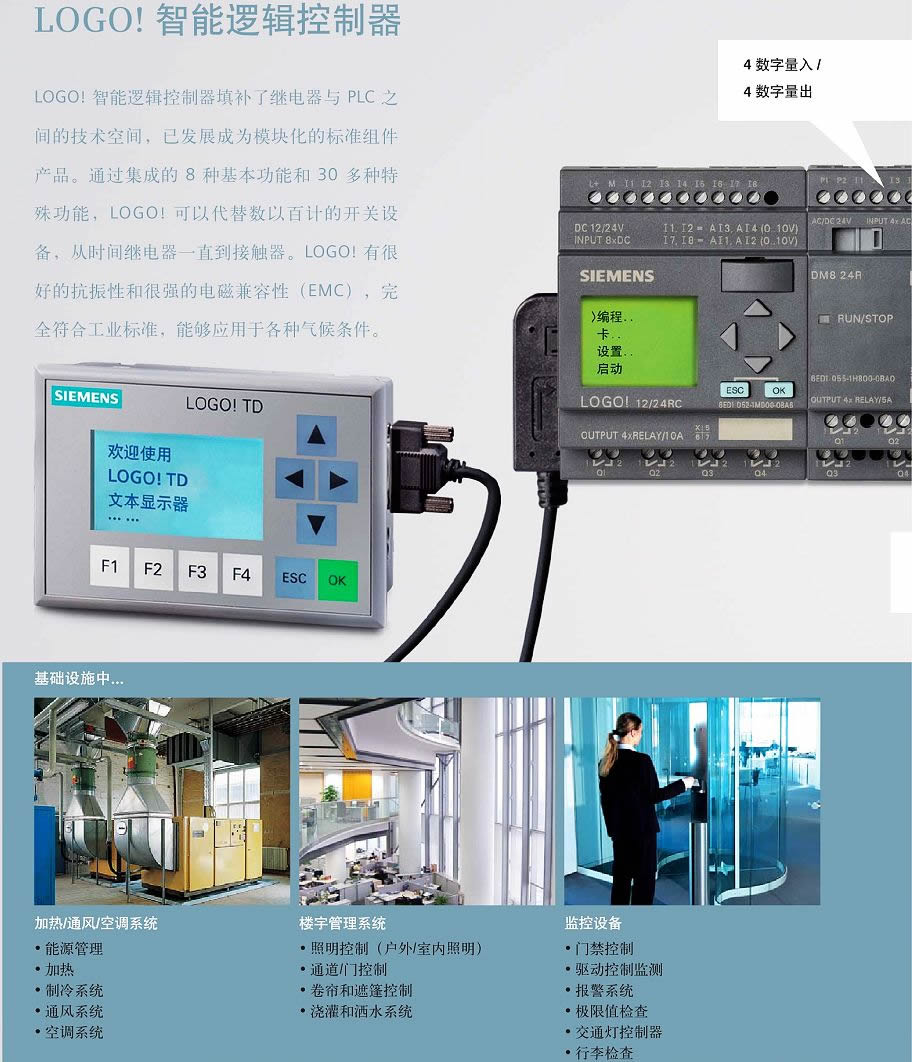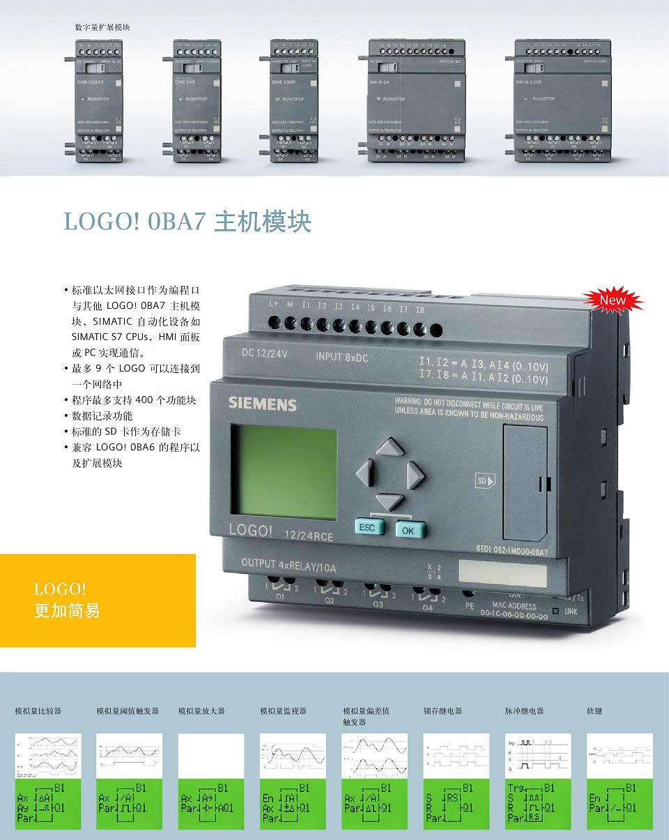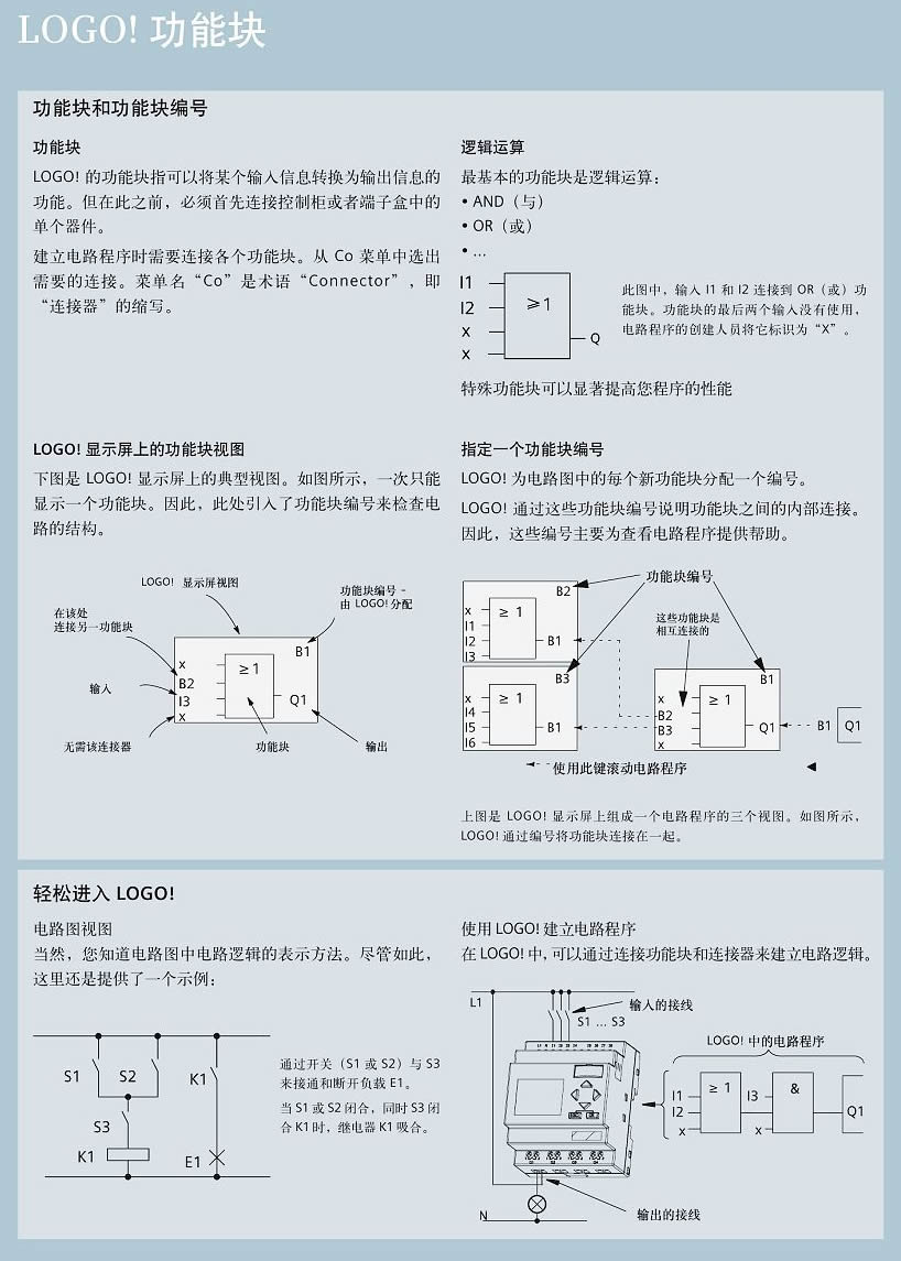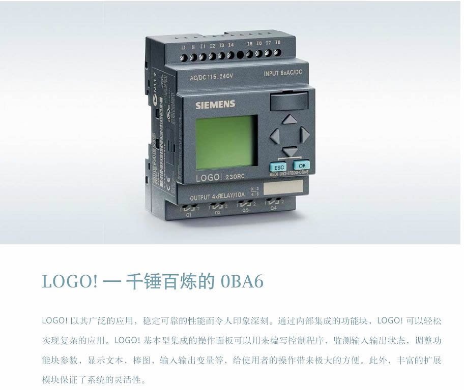 LOGO! 智能邏輯控制器填補了繼電器與PLC之間的技術(shù)空間,已發(fā)展成為模塊化的標(biāo)準(zhǔn)組件產(chǎn)品。通過集成的8種基本功能和30多種特殊功能,LOGO! 可以代替數(shù)以百計的開關(guān)設(shè)備,從時間繼電器一直到接觸器。LOGO! 有很好的抗振性和很強的電磁兼容性(EMC),完全符合工業(yè)標(biāo)準(zhǔn),能夠應(yīng)用于各種氣候條件。