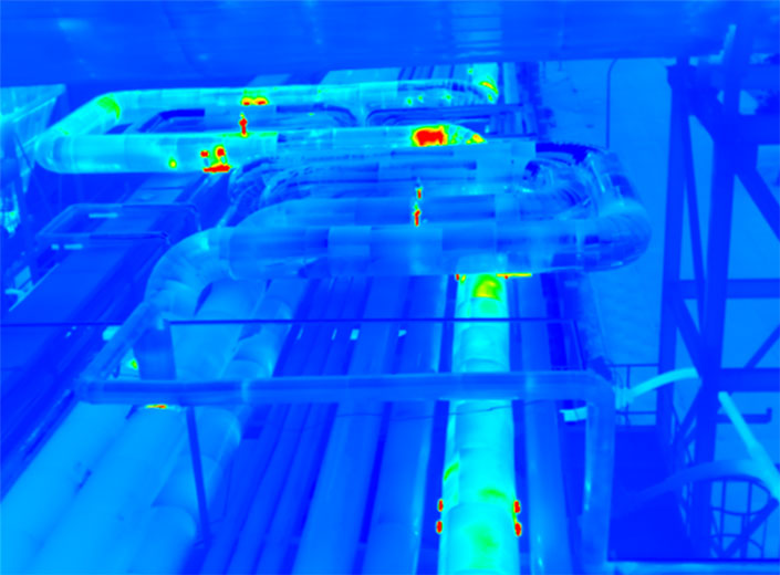- 管道是生產(chǎn)的重要輸送設(shè)備,大多管線均是架空或埋地設(shè)計(jì)且數(shù)量眾多。使用熱像儀能直觀有效地檢測管道堵塞、減薄、腐蝕、滲漏及管道保溫層狀態(tài),減少能耗,保障生產(chǎn)及人員安全。